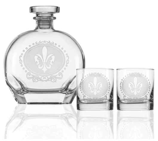 Dishwasher safe Domestic and imported glass Sand-etched in the USA by Rolf Glass One 23 oz Whiskey Decanter Two 11 oz On the Rocks glasses